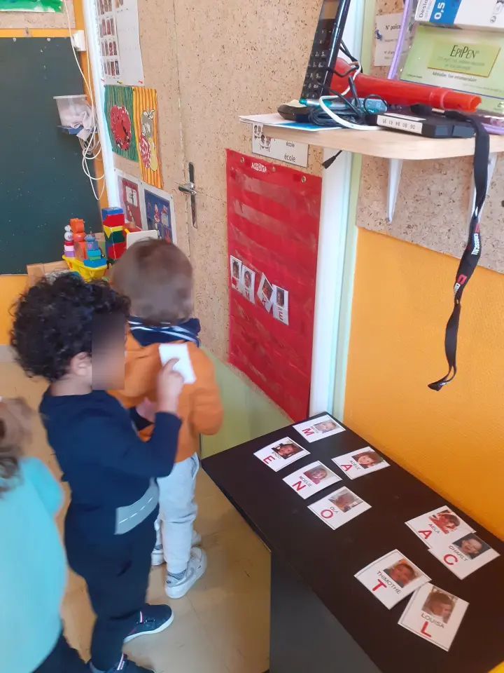 Les premiers apprentissages se font également quotidiennement avec la reconnaissance de son prénom sur une étiquette tous les matins.